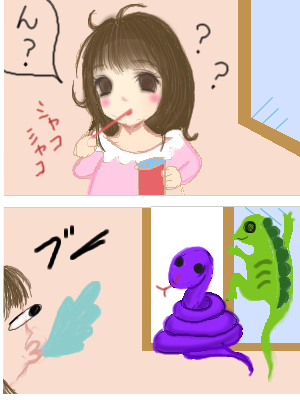 例えば、「こんなところに棒が落ちてる」「天井からヒモが?」よーく見れば蛇!!